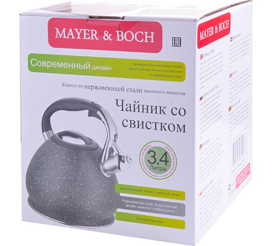 Чайник MAYER&BOCH изготовлен из высококачественной нержавеющей стали. Изделия из нержавеющей стали не окисляются и не впитывают запахи, благодаря чему вы всегда получите натуральный, насыщенный вкус и аромат напитков.