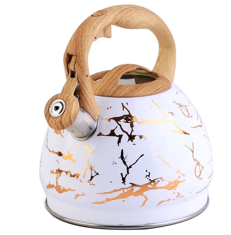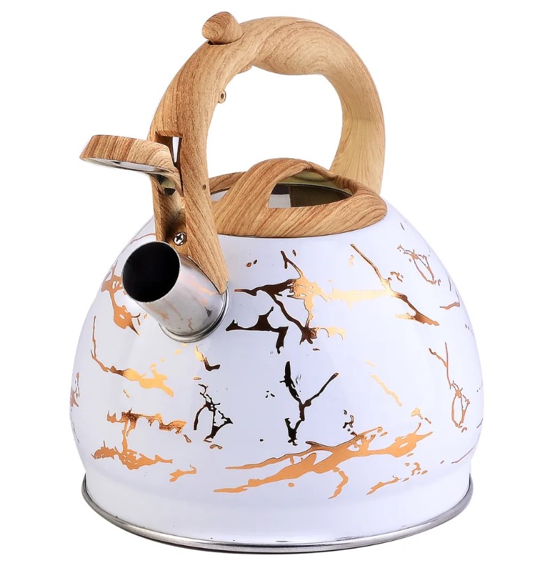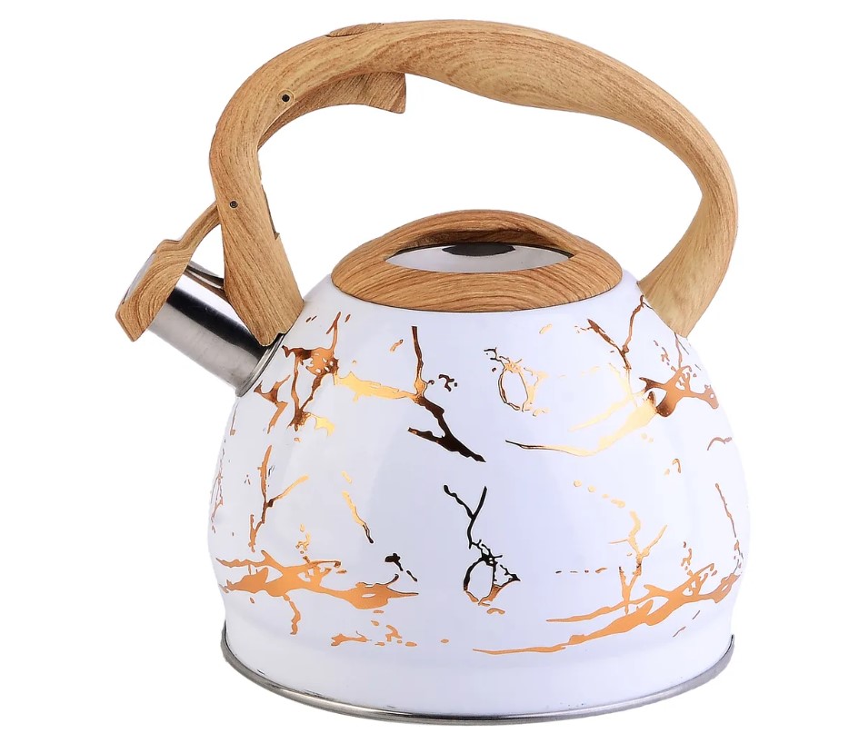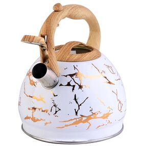 Чайник MAYER&BOCH изготовлен из высококачественной нержавеющей стали. Изделия из нержавеющей стали не окисляются и не впитывают запахи, благодаря чему вы всегда получите натуральный, насыщенный вкус и аромат напитков. Фиксированная эргономичная ручка выполнена из термостойкого пластика с бархатистым покрытием. На ручке расположена клавиша механизма открывания носика. Носик чайника оснащен насадкой-свистком, который позволяет контролировать процесс кипячения или подогрева воды. Поверхность чайника имеет оригинальный золотистый рисунок. Эстетичный и функциональный, с современным дизайном, чайник будет замечательно смотреться на любой кухне. Подходит для использования на всех типах плит, включая индукционные.