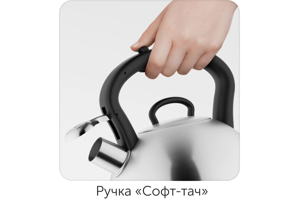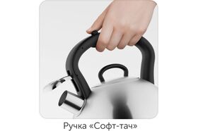 Эргономичная ручка с покрытием софт-тач выполнена из термостойкого материала, поэтому не нагревается, позволяя пользоваться чайником без прихваток. За счет удачно расположенной кнопки на ручке и широкому носику наполнять чайник гораздо проще и безопаснее. Плотно прилегающая крышка устраняет риски обжечься.