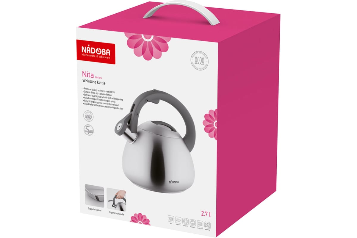 Громкий и безопасный свисток всегда оповестит, что пора наливать чай. Чайник со свистком NADOBA серии Nita 2,7 л допускается мыть в посудомойке.