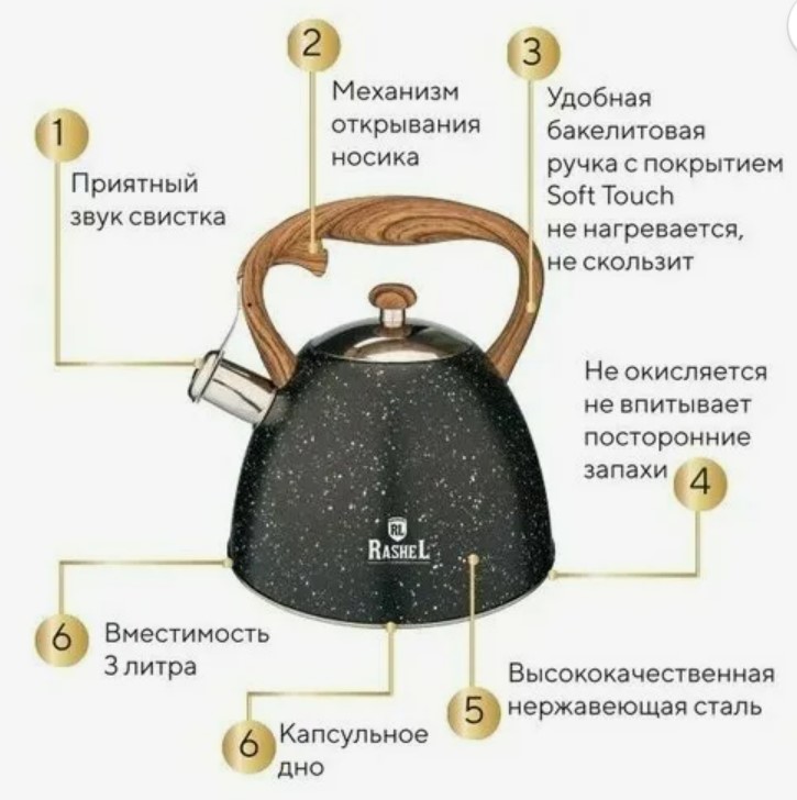 Чайник из нержавеющей стали RASHEL 3 л, со свистком, чёрный М-7147 предназначен для бытового использования. Современный и функциональный чайник будет замечательно смотреться на любой кухне. Подходит для всех видов плит.