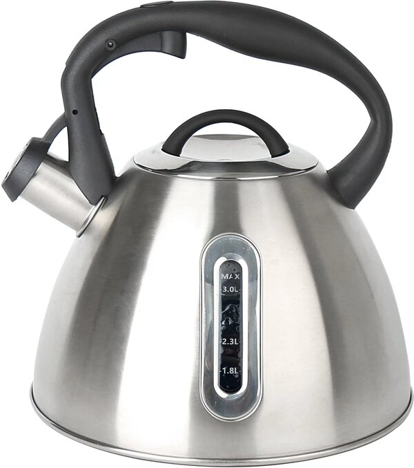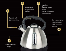 Чайник со свистком из нержавеющей стали 3 литра- идеальное решение для вас. Чайник для плиты имеет бакелитовую ручку с прорезиненным покрытием с рычагом для открывания носика. Эргономичная комбинированная фиксированная ручка с покрытием "soft-touch". Чайник для плиты газовой имеет удобный курковый механизм.