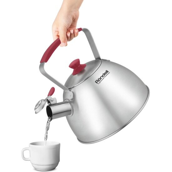 Изысканная сатинированная полировка корпуса. Аксессуары: силиконовая накладка на клапане свистка. Стальная ручка с силиконовой вставкой. Преимущества: возможность налива воды одной рукой. Удобный хват. Фиксируемый клапан свистка. Упаковка: подарочная упаковка с ручкой.