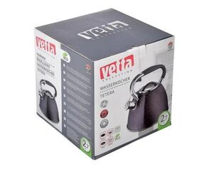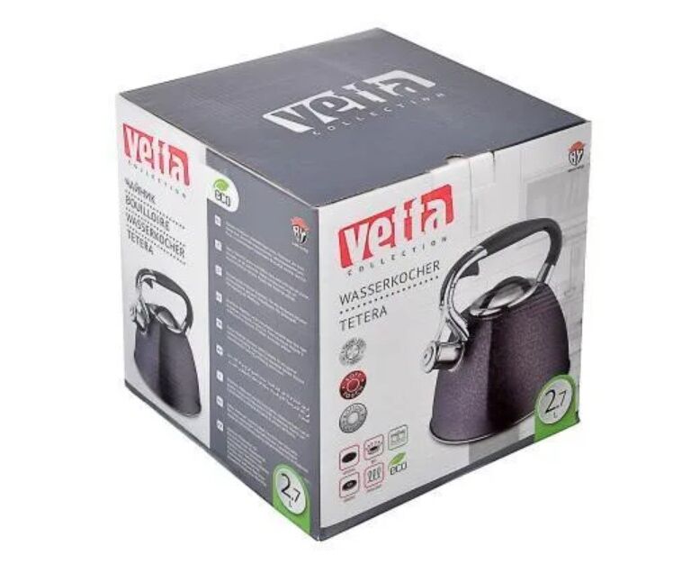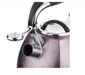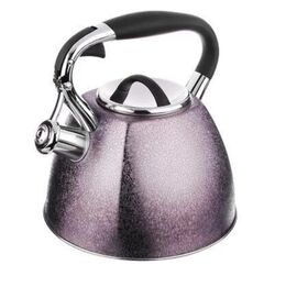 Чайник объемом 2,7 л необычной формы изготовлен из матовой нержавеющей стали, оснащен несъемным свистком на кнопке и эргономичной ручкой из бакелита с силиконовым напылением, с капсульным дном, подходит использования на всех типах плит, включая индукцию.