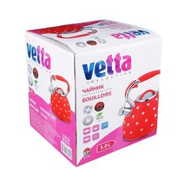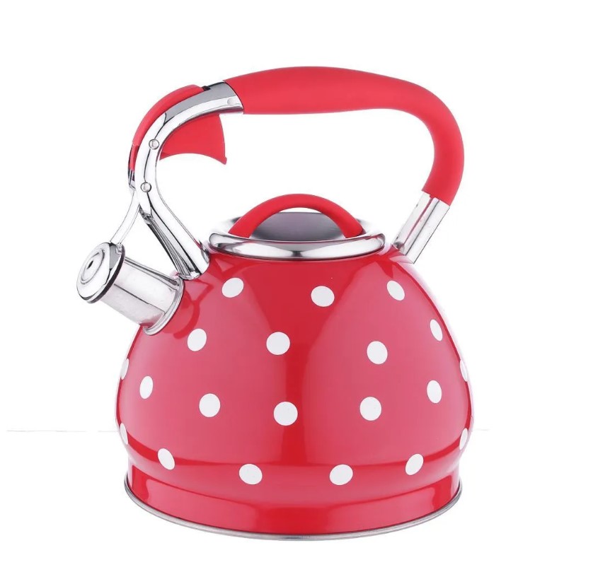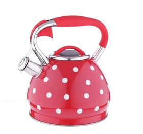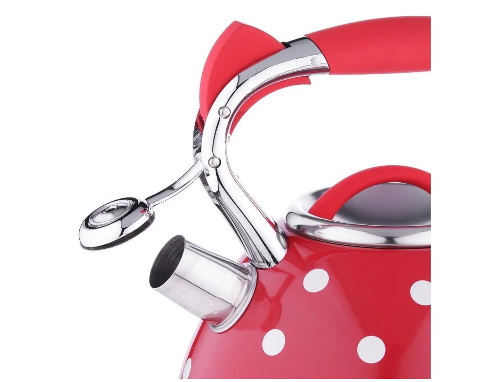 Чайник объемом 3 л изготовлен из нержавеющей стали и имеет привлекательную внешнюю окраску - белый горох на красном фоне, оснащен несъемным свистком на кнопке и ручкой из нержавеющей стали с силиконовым напылением, с капсульным дном, подходит для всех видов плит, включая индукцию.