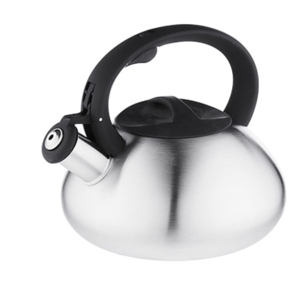 Чайник объемом 2,5 л изготовлен из нержавеющей стали, зеркальный, с несъемным свистком на кнопке и бакелитовой ручкой черного цвета подходит для всех типов плит, включая индукцию.