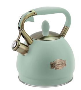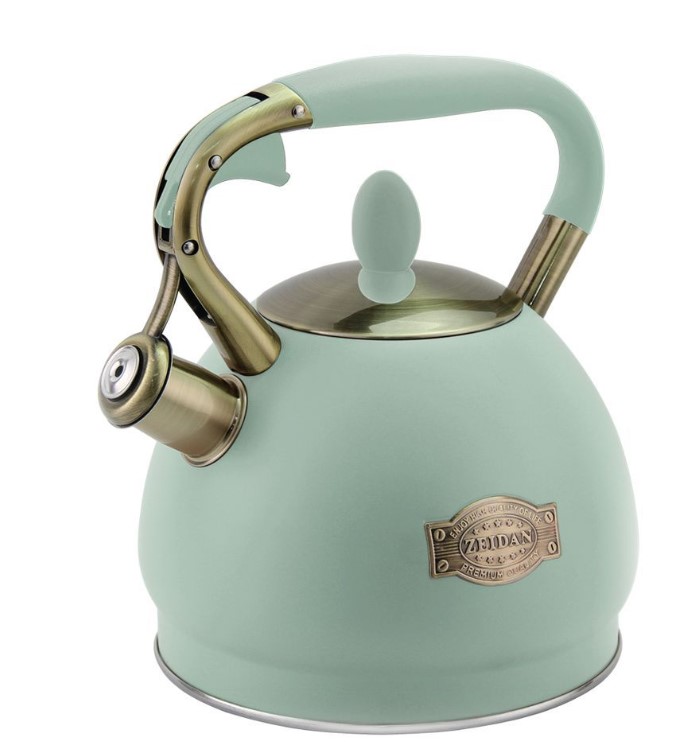 Чайник со свистком ZEIDAN Z-4350 объемом 3 л. Выполнен из нержавеющей стали, капсулированное индукционное дно, курковый механизм открытия свистка, внешнее покрытие - антипригарное цветное покрытие, устойчивое к высоким температурам, комбинированная ручка с покрытием soft-touch, декоративные элементы под бронзу.