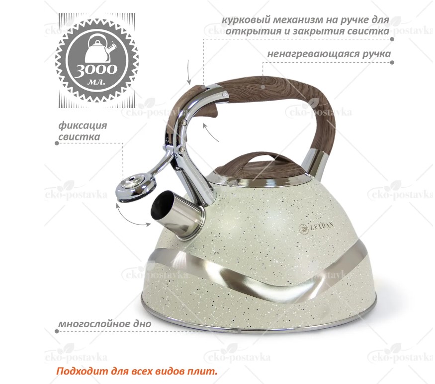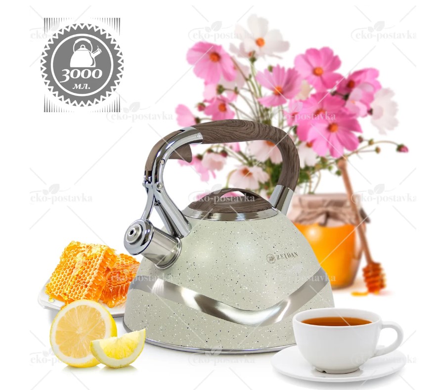 Чайник Zeidan Z-4369 объемом 3 л. Оснащен свистком, благодаря которому вы не пропустите момент закипания. Изготовлен из нержавеющей стали, капсулированное индукционное дно, курковый механизм открытия свистка. Внешнее покрытие антипригарное цветное. Устойчивое к высоким температурам. Ручка с покрытием softtouch.