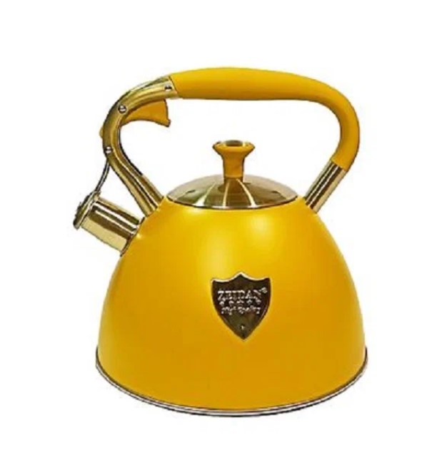Чайник со свистком 3,0 л, Чайник изготовлен из нержавеющей стали. Капсулированное индукционное дно, курковый механизм, внешнее покрытие - антипригарное цветное покрытие, устойчивое к высоким температурам, комбинированная ручка с покрытием "soft-touch", ДЕКОРАТИВНЫЕ ЭЛЕМЕНТЫ "ПОД БРОНЗУ". Упаковка - подарочная коробка с пластиковой ручкой.