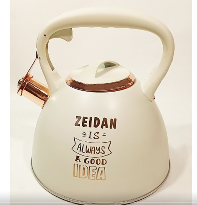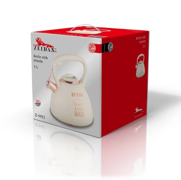 Чайник Z-4421 со свистком,белая 3,0 л, нержавеющая сталь, капсулированное индукционное дно, курковый механизм, внешнее покрытие - антипригарное цветное покрытие, устойчивое к высоким температурам, бакелитовая ручка с покрытием "soft-touch", ДЕКОРАТИВНЫЕ ЭЛЕМЕНТЫ "ПОД ЗОЛОТО ",подарочная упаковка,Zeidan