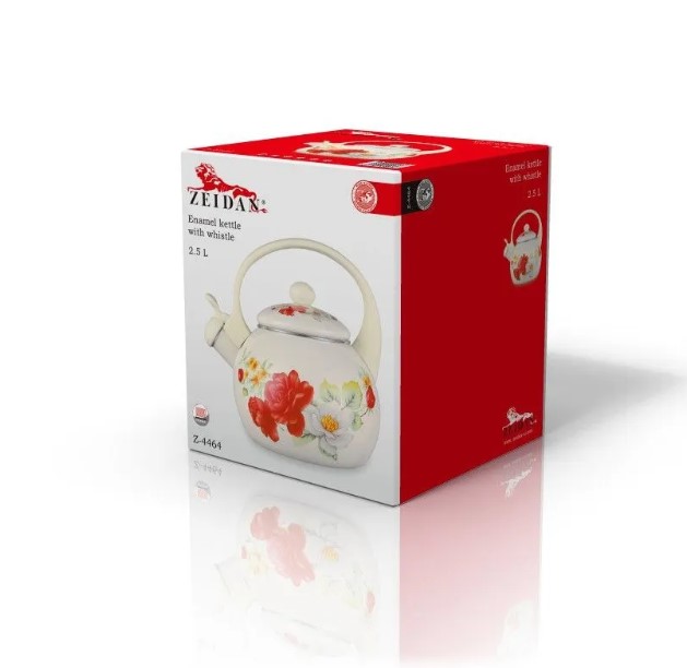 Чайник Zeidan Z-4464 обьемом 2,5 литра. Изготовлен из эмалированной стали. Внутреннее и внешнее покрытие - эмаль. Со свистком