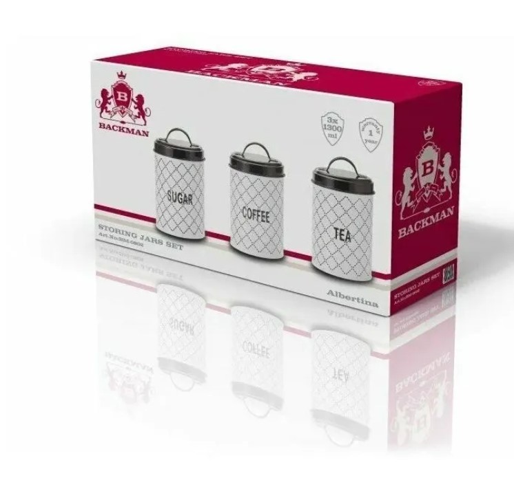 Набор банок для хранения сыпучих продуктов BACKMAN BM-0802, 1300 мл, Набор банок 3 пр. для хранения сыпучих продуктов, (объем: 3х1300 мл). Материал корпуса – высококачественная сталь, крышка "под дерево". Подарочная упаковка.
