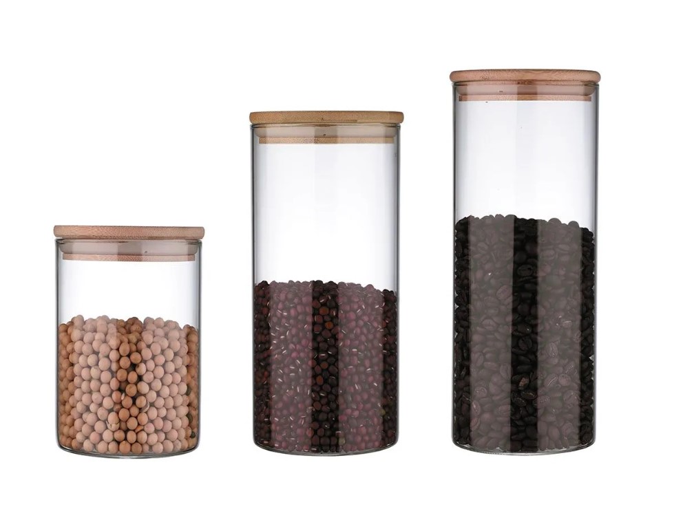 В наборе баночки из высококачественного боросиликатного стекла с крышками из бамбука.
