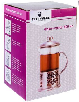 Френч-пресс объемом 0,8 л, изготовлен из высококачественной нержавеющей стали и термостойкого стекла. Наличие фильтра-поршня обеспечивает равномерную циркуляцию воды, служит для отжима заварки или кофейной гущи, не позволяя кофеинкам и чаинкам оказываться в чашке. Эргономичную ручку френч-пресса удобно держать в руках. Особая форма носика предотвращает образование подтеков.