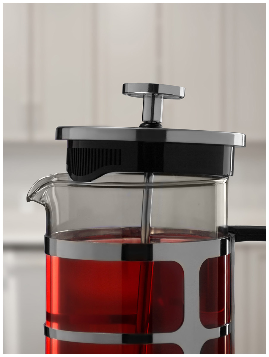 Френч-пресс изготовлен из стекла, пластика и высококачественной нержавеющей стали. Предназначен для приготовления кофе или чая, методом настаивания и отжима. Колба из боросиликатного стекла жароустойчива, выдерживает температуру 100°С, не впитывает запахи. Пресс-фильтр плотно прижимает частички кофе или заварки ко дну френч-пресса, а уплотнительное кольцо не дает им попасть в напиток. Прозрачный корпус позволяет наблюдать за процессом насыщения напитка. У френч-пресса удобная ручка, плотная закрывающаяся крышка.