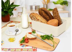 Хлебница состоит из легко моющейся пластиковой основы с нескользящими ножками и высококачественной бамбуковой крышки, которая при переворачивании превращается в разделочную доску для хлеба. Доска имеет канавки для сбора крошек.Вообще, вы можете использовать данное изделие как мультифункциональный контейнер для хранения любых пищевых продуктов на кухне. Контейнер с крышкой можно ставить в холодильник.