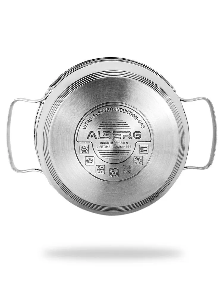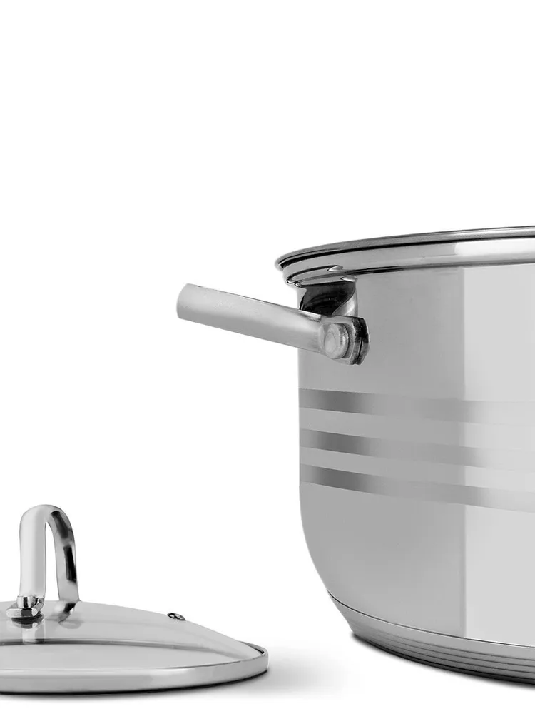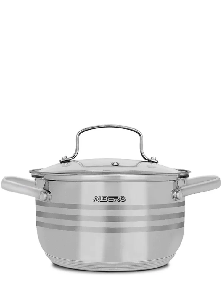 Кастрюля произведена из высококлассной нержавеющей стали. Металл устойчив к механическим повреждениям и образованию ржавчины. Подходит для приготовления блюд на различных плитах, включая галогеновую и индукционную. Емкость кастрюли — 6,5 л. Диаметр дна составляет 24 см. На внутренней поверхности посуды нанесена мерная шкала.