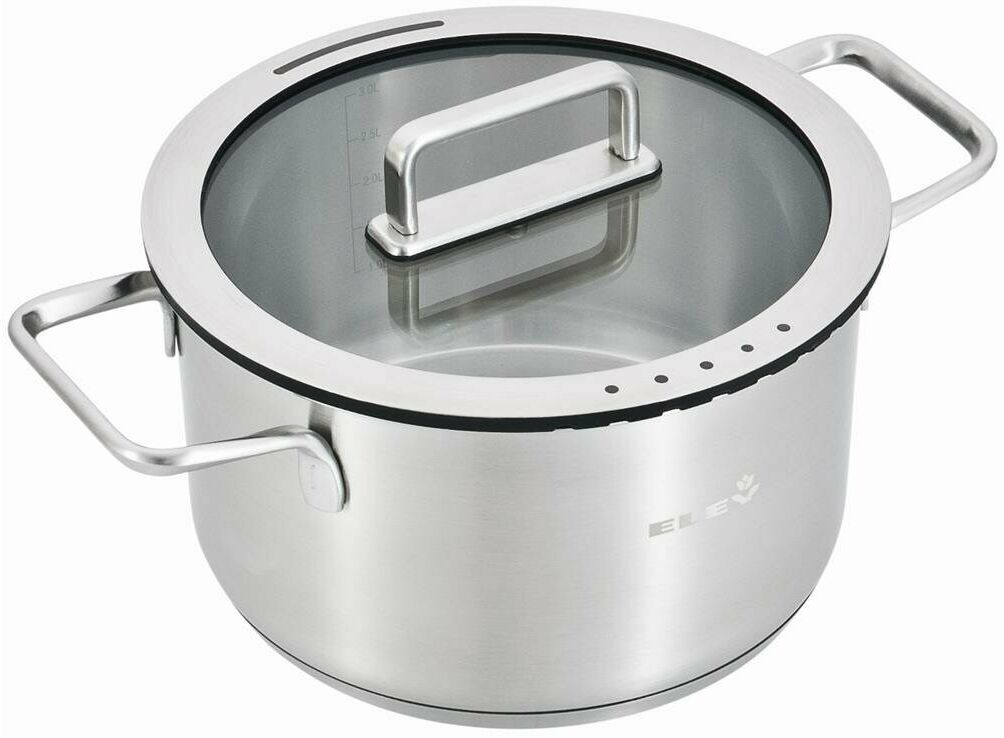 Предпочитаете современный минималистичный дизайн? Тогда посуда коллекции ELEY точно придется вам по вкусу! С первого взгляда она очаровывает простыми формами, которые гармонично впишутся в любой кухонный интерьер. Настоящие эстеты по достоинству оценят сочетание матированной полировки корпуса с глянцевыми аксессуарами: эффектное и очень изысканное. Кастрюля с крышкой ELEY 18 см 2,5 л изготовлена из высококачественной нержавеющей стали 18/10, которая гарантирует посуде длительный срок службы. Пятислойное капсульное дно обеспечивает быстрый равномерный прогрев всей поверхности и идеальное приготовление блюд. Кастрюля оснащена крышкой из термостойкого стекла с отверстием для выхода пара. Для особого удобства в использовании на внутренней поверхности стенки посуды имеются отметки литража. Толщина дна - 4,5 мм Подходит для всех видов плит, включая индукционные. Подходит для посудомоечной машины. Специальное силиконовое обрамление крышки делает данную посуду еще более стильной, а также защищает ваши руки от ожогов!
