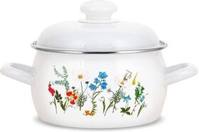 Кастрюля Эстет "Луговые цветы" изготовлена из высококачественного стального проката и покрыта стеклокерамической эмалью. Внутри и снаружи - трехслойное глянцевое эмалированное покрытие. Эмалевое покрытие, являясь стекольной массой, не вызывает аллергию и надежно защищает пищу от контакта с металлом. Кроме того, такое покрытие долговечно, оно устойчиво к механическому воздействию, не царапается, а стальная основа практически не подвержена механической деформации, благодаря чему срок эксплуатации увеличивается. Крышка с эмалированным покрытием оснащена удобной ручкой, куполообразная форма крышки минимизирует выкипание в процесе приготовления пищи. Она плотно прилегает к краю, сохраняя аромат блюд. Подходит для всех типов плит, включая индукционные. Можно мыть в посудомоечной машине