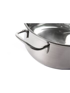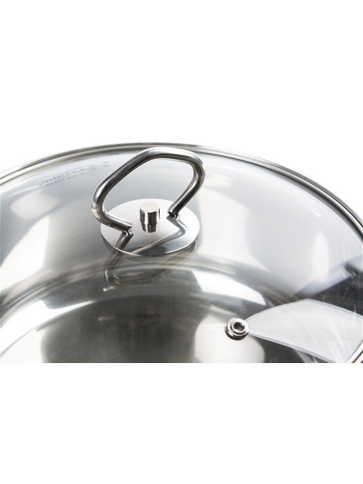 Крышка из жаростойкого прозрачного стекла, оснащена ручкой, металлическим ободом и отверстием для выпуска пара