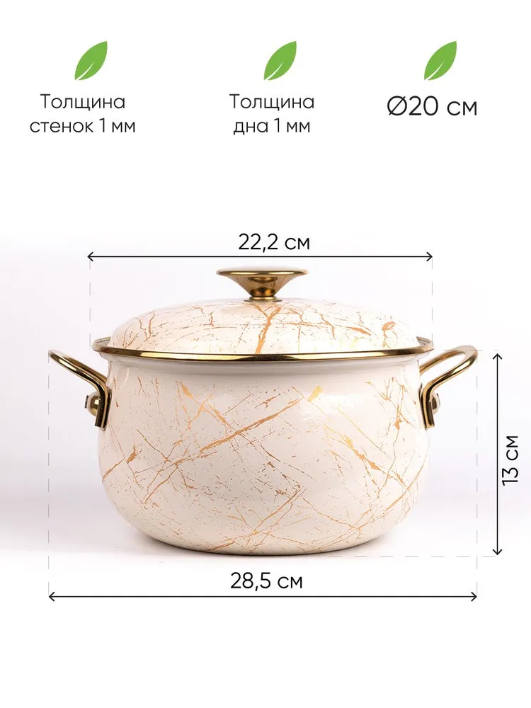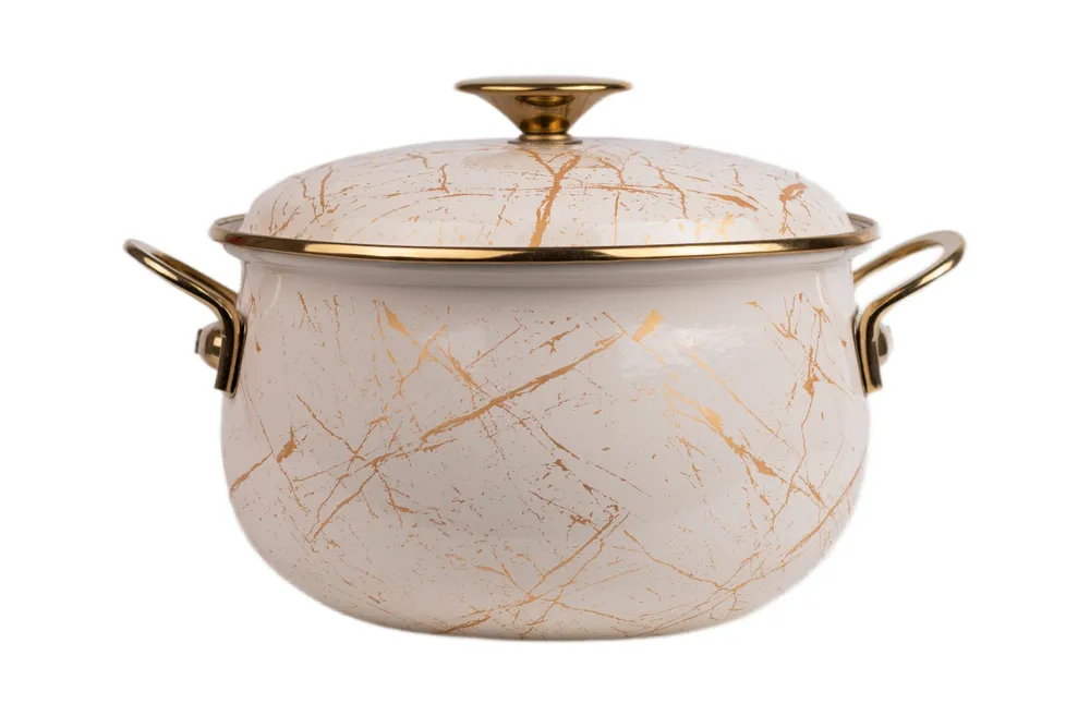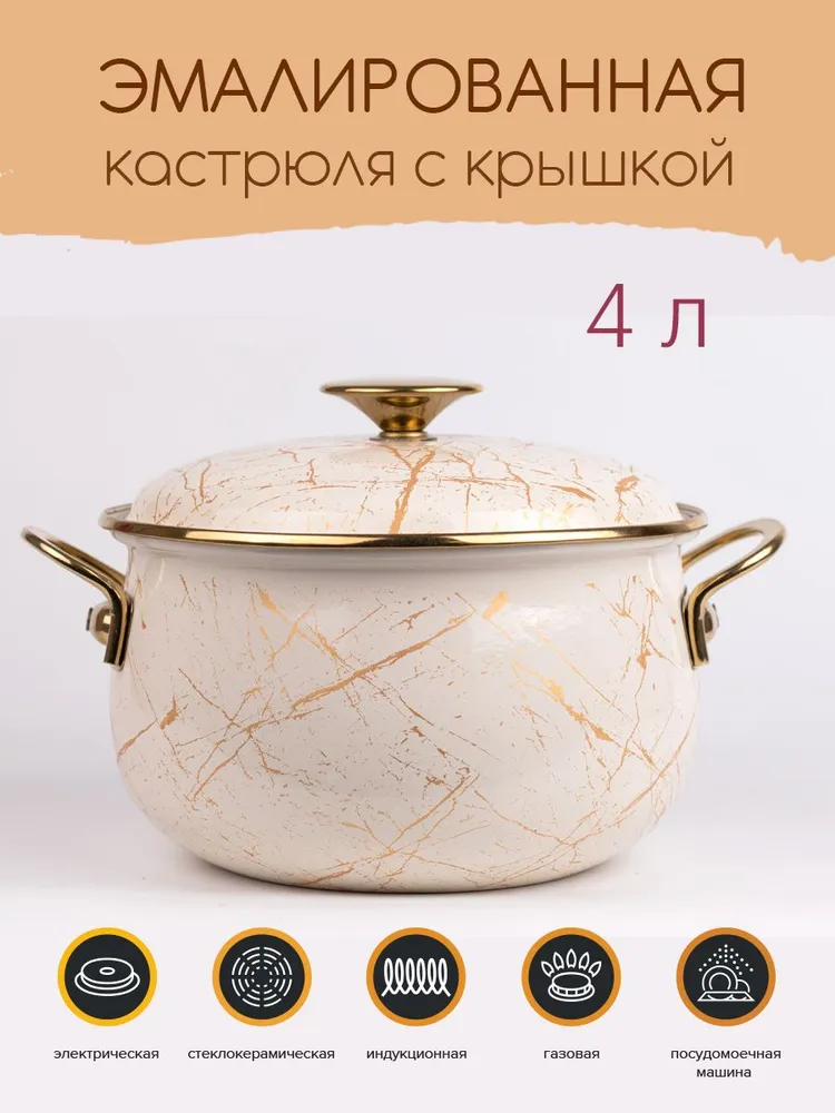 Кастрюля обладает двухслойным покрытием из жаропрочной эмали. Дно сделано из ферромагнитного материала, поэтому модель можно эксплуатировать на индукционных плитах. Допускается нагрев на стеклокерамических, газовых и чугунных конфорках.