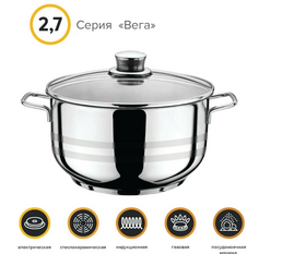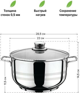 Кастрюля обладает объемом 2,7 л. Габаритные размеры изделия — 21,8х9,5х9,5 см, толщина дна — 3 мм, стенки — 0,5 мм. Корпус и ручки модели выполнены из нержавеющей стали с антипригарным покрытием. Кастрюля оборудована алюминиевым дном.