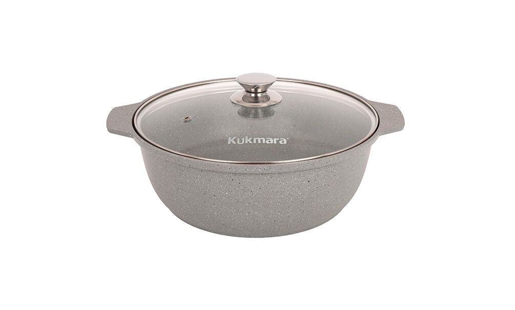 Кастрюля-жаровня Kukmara с антипригарным покрытием имеет ровное, окрашенное дно, которое обеспечивает идеальное прилегание дна посуды к плите для более быстрого и равномерного нагрева посуды и не царапает нежную поверхность стеклокерамической плиты.