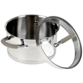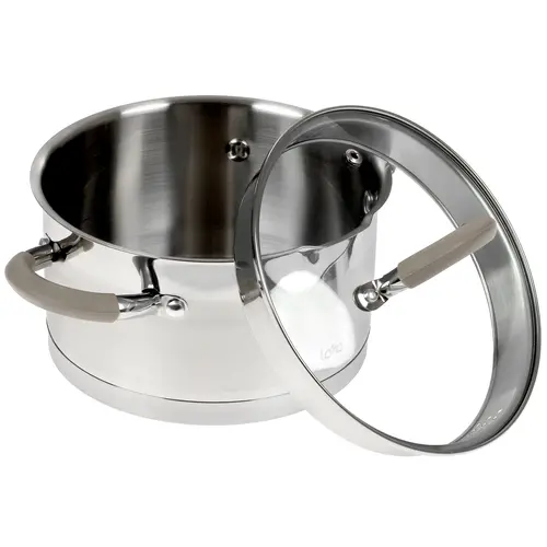 Посуда дополнена плотной крышкой из термостойкого стекла с металлическим ободком и ненагревающейся ручкой.