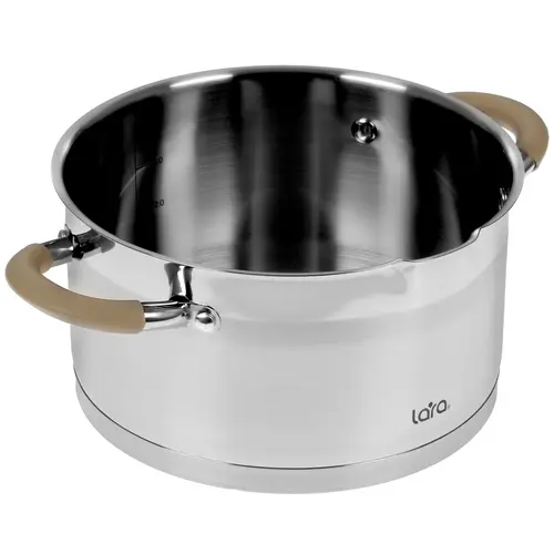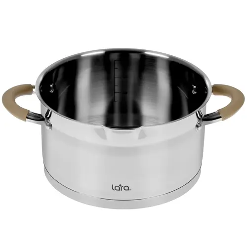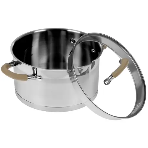 Изделие оснащено двумя металлическими ручками с нескользящими силиконовыми накладками. Кастрюля поставляется с прозрачной крышкой из термостойкого стекла с удобной ручкой и двусторонним носиком для аккуратного слива воды. Данная модель дополнена индукционным капсулированным дном и комбинированной полировкой.