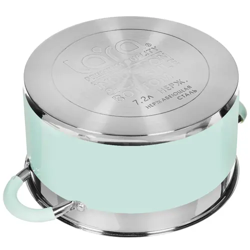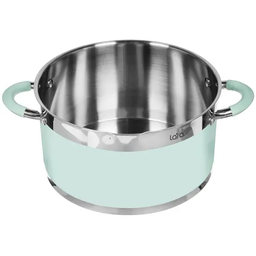 Кастрюля изготовлена из прочной и простой в уходе нержавеющей стали. Изделие имеет естественную серебристую расцветку, дополняется зелеными вставками и матовой двусторонней полировкой.