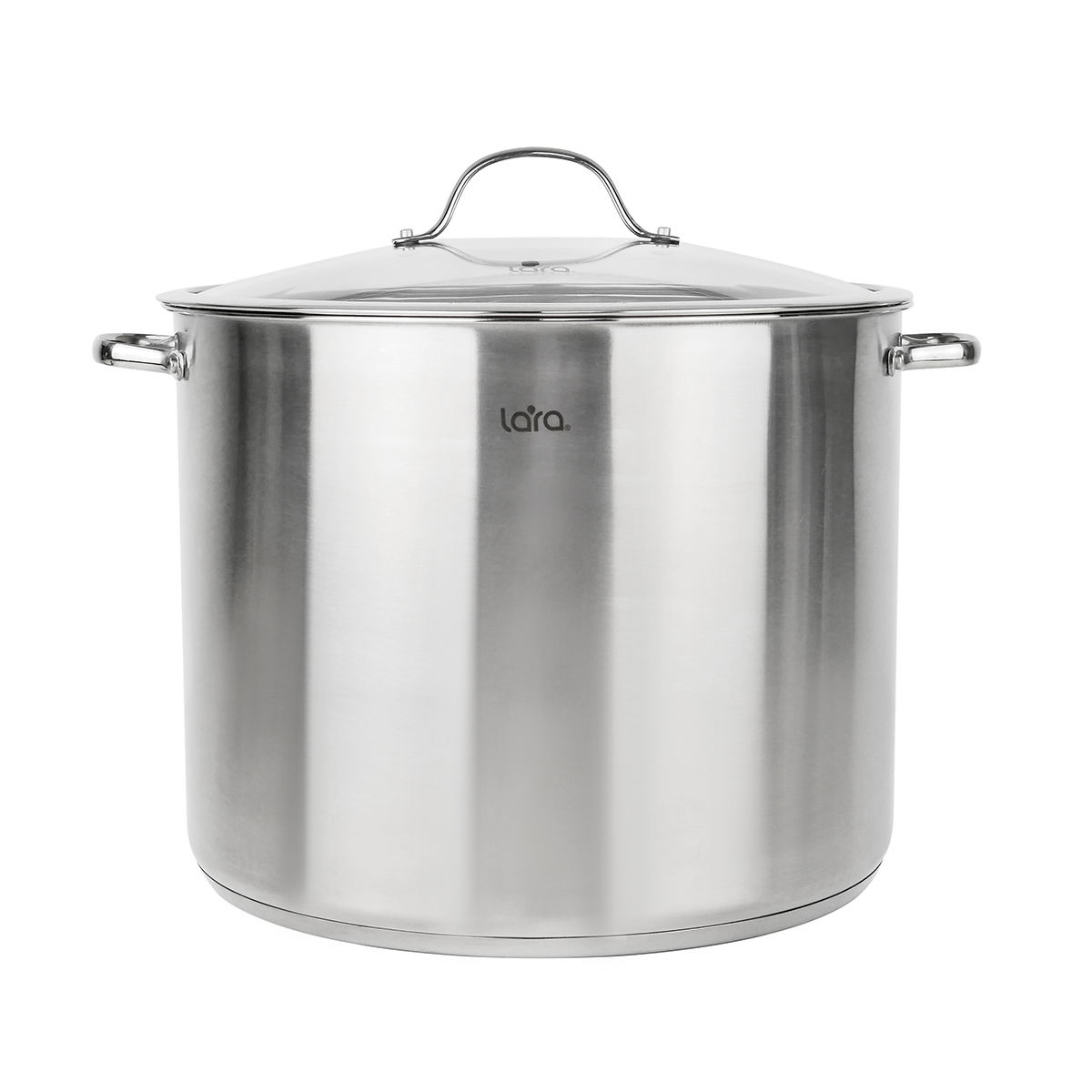Кастрюли серии «АТЛАНТ» – посуда увеличенного объема, которая подойдет не только для дома, но и для профессиональных кухонь ресторанов, кафе и столовых. Премиальная нержавеющая сталь, не окисляется, не впитывает вкусы и запахи продуктов, легко ухаживать а так же можно мыть в посудомоечной машине. Прочные заклепки и плотное крепление ручек, гарантируют безопасное использование посуды. Крышка выполнена из устойчивого к высоким температурам стекла и металла, оснащена встроенным паровыпуском. Толстое 5-ступенчатое капсулированное дно равномерно распределяет нагрев по всей посуде – идеально подходит для варки, тушения, кипячения супов и других способов тепловой обработки продуктов.