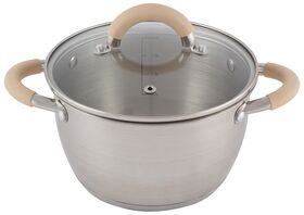 Кастрюля из нержавеющей стали с крышкой Fortuna 2,5 л V-shape, подходит для всех типов плит, матовая внутри и снаружи, имеет отметки литража. Крышка из жаропрочного стекла с отверстием для выпуска пара С-тип, ручки полые из нержавеющей стали 201 с силиконовыми вставками.