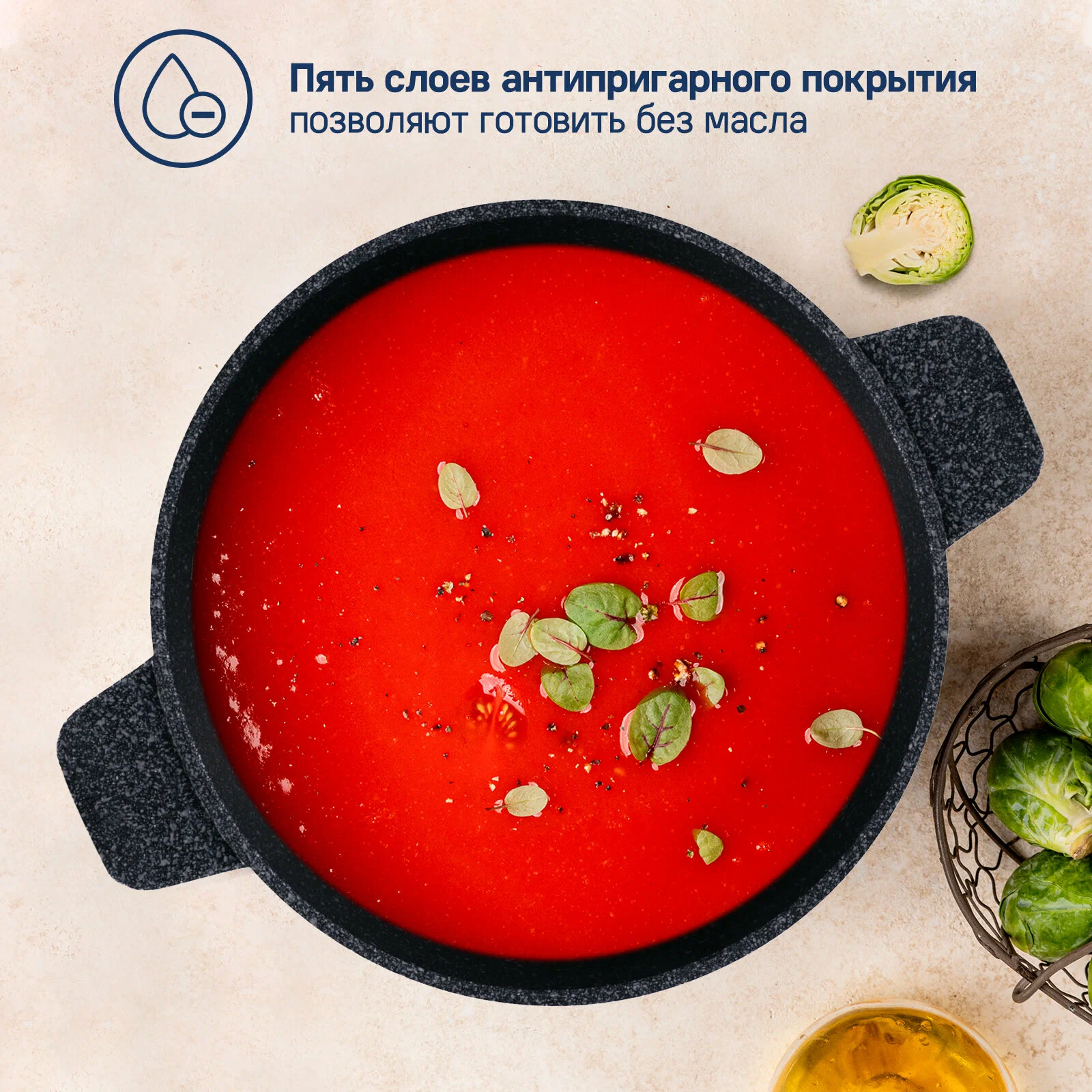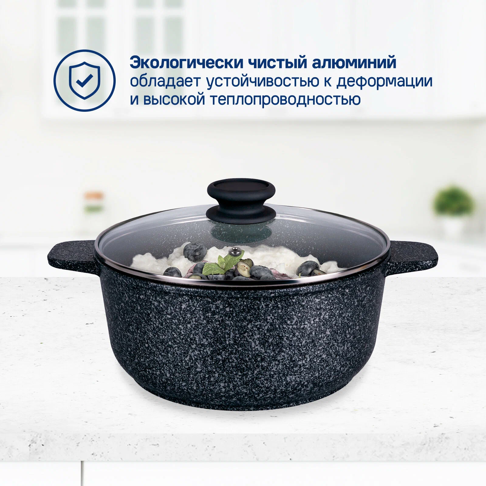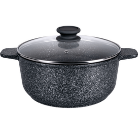 Пять слоев безопасного антипригарного покрытия, не меняет вкус и аромат еды. Кастрюля с эффектным мраморным покрытием и современной ручкой в универсальном сером цвете, будет отлично сочетаться с любой кухней.