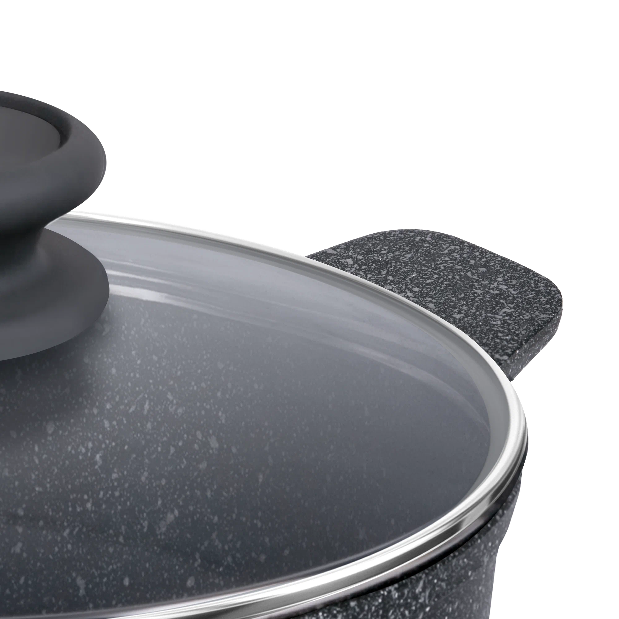 Крышка с паровыпуском из жаропрочного стекла, и ободком из нержавеющей стали. Держатель из термостойкого бакелита с покрытием soft-touch.