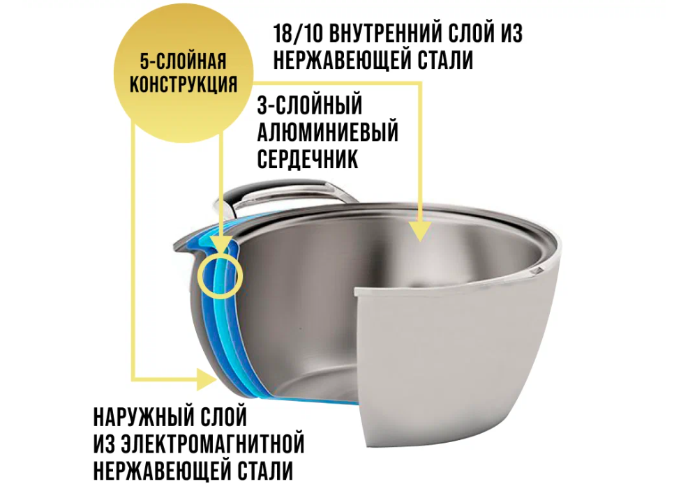 Кастрюля с крышкой выполнен из высококачественной нержавеющей стали с многослойным термоаккумулирующим дном, способствующим высокой теплопроводности и равномерному распределению тепла.