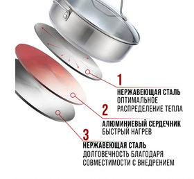 Кастрюля с крышкой выполнена из высококачественной нержавеющей стали с многослойным термоаккумулирующим дном, способствующим высокой теплопроводности и равномерному распределению тепла. Обладает высокой устойчивостью к коррозии, не вступает в реакцию с холодными и горячими продуктами и полностью сохраняет их вкусовые качества.