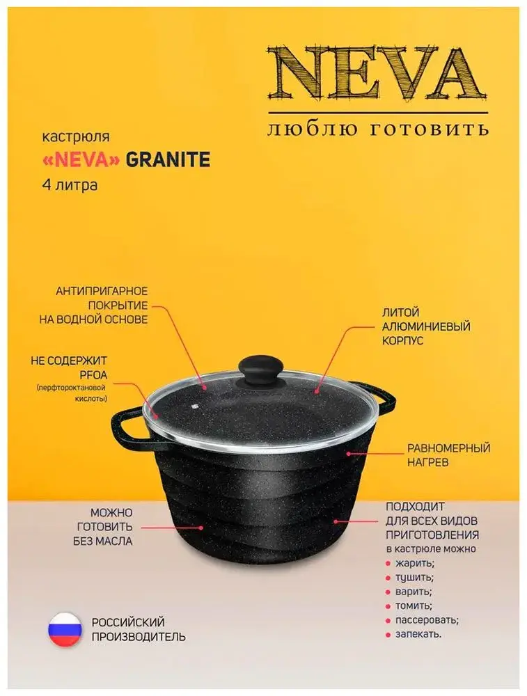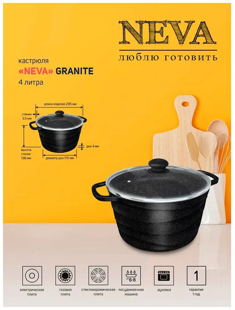 Кастрюля NEVA «Neva Granite» - литой прочный корпус, равномерный нагрев, не деформируется, не качается на плите.