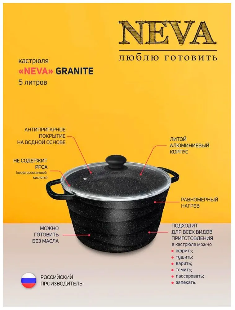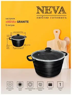 Кастрюля NEVA «Neva Granite» - литой прочный корпус, равномерный нагрев, не деформируется, не качается на плите.