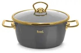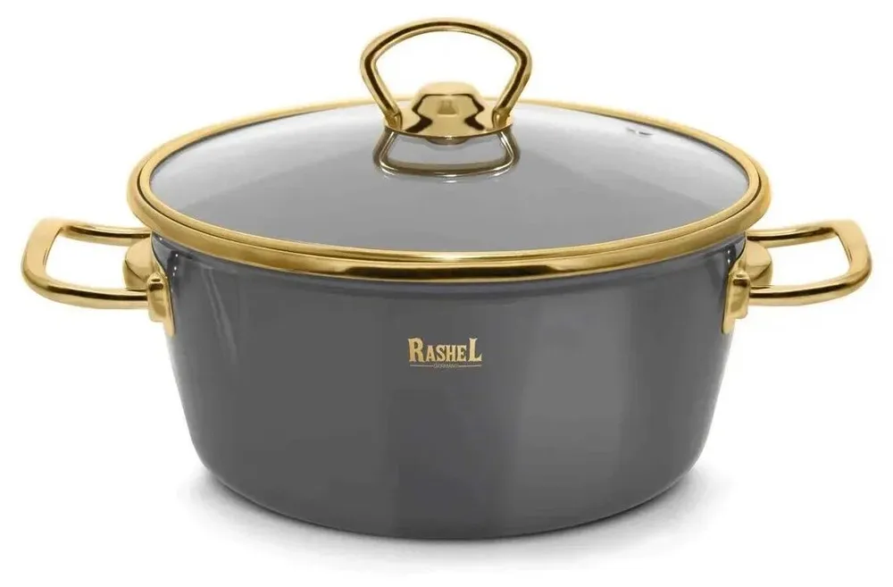 Ручки из нержавеющей стали 18/10 покрытые золотом; Стеклянная крышка; Наружное и внутреннее трёхслойное глянцевое эмалированное покрытие; Внутреннее белое эмалированное покрытие; Индивидуальная подарочная упаковка; Подходит для всех видов плит, включая индукционные.