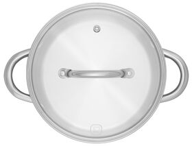 Материал: высококачественная нержавеющая сталь 18/10. Технология: тройное вштампованное, а затем вплавленное дно без воздушных полостей. Материал крышки: термостойкое стекло. Аксессуары: стальная ручка. Преимущества: оригинальное сочетание матовой полировки корпуса и глянцевой полировки аксессуаров