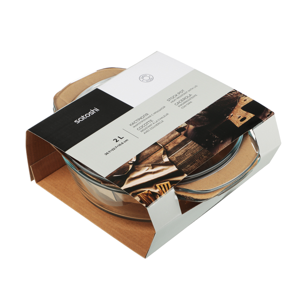 Кастрюля жаропрочная с крышкой SATOSHI из стекла размером 26,7х22,7х10,6 см и объемом 2 л – это удобная посуда для приготовления разнообразных блюд в духовке. Подходит для запекания мяса, рыбы, овощей, а также приготовления воздушных омлетов и запеканок. Толстое стекло выдерживает высокий температурный нагрев, а также устойчиво к механическим воздействиям. Обладает высокими гигиеническими свойствами: не накапливает запахи, не окрашивается в цвет продуктов. Равномерно прогревается и обладает антипригарными свойствами.