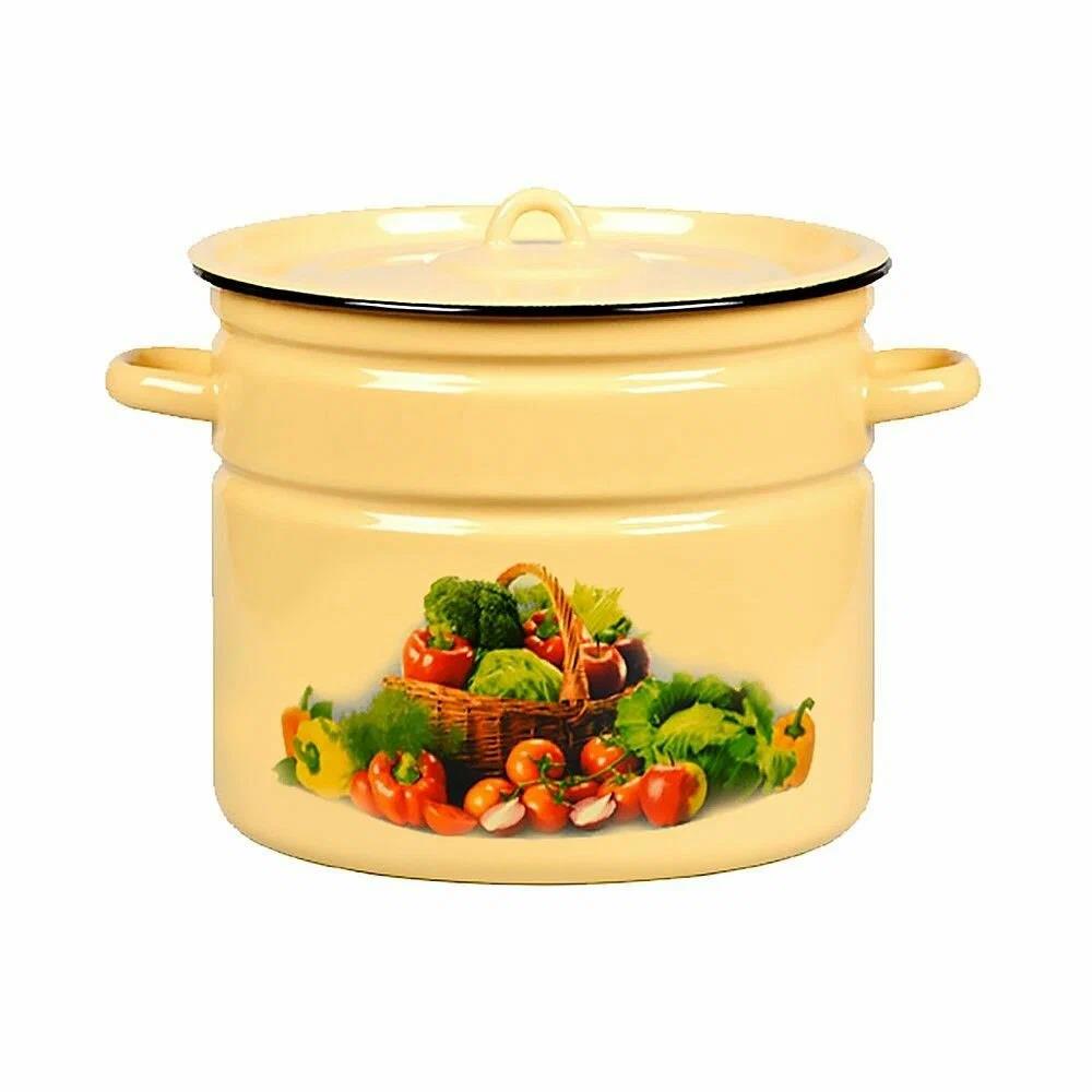 Кастрюля выполнена из качественной стали, что делает ее прочной и долговечной. Она имеет эмалированное покрытие, которое обеспечивает легкость в уходе и чистке. Она подходит для любых видов плит и посудомоечных машин. Покрытие инертно и устойчиво к пищевым кислотам, не вступает во взаимодействие с продуктами и не искажает их вкусовые качества. Диаметр верха 25 см; Диаметр дна 23 см; Толщина дна 0.8 мм; Высота стенок 21 см; Толщина стенок 0.8 мм. Рисунок фрукты или овощи.