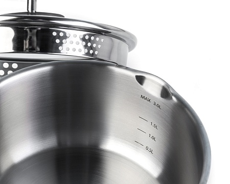 Удобные отметки литража на внутренней поверхности посуды позволяют не использовать при приготовлении дополнительную мерную посуду.