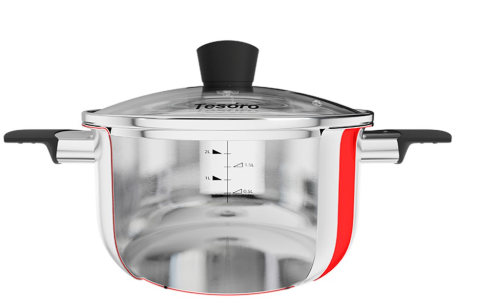 Средний слой – алюминий. Этот материал обладает отличной теплопроводимостью, благодаря чему тепло быстро распределяется по всей поверхности кастрюли от дна до верха.