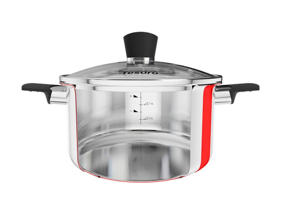 Средний слой – алюминий. Этот материал обладает отличной теплопроводимостью, благодаря чему тепло быстро распределяется по всей поверхности кастрюли от дна до верха.