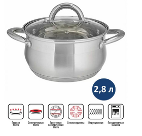 Кастрюля подходит для приготовления блюд на газовых, чугунных, галогеновых, стеклокерамических и индукционных конфорках.