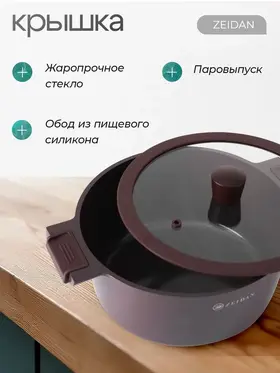 Жаропрочная стеклянная крышка с силиконовым ободом и деревянной ручкой;