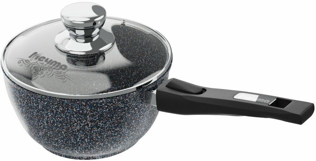 Алюминиевый ковш обладает объемом 1,7 л. Модель можно использовать на любых типах плит. В комплект входит прозрачная стеклянная крышка с пароотводным отверстием. Съемная ручка выполнена из бакелита — термоустойчивого материала, который всегда остается холодным. Эта модель снабжена антипригарным покрытием.
