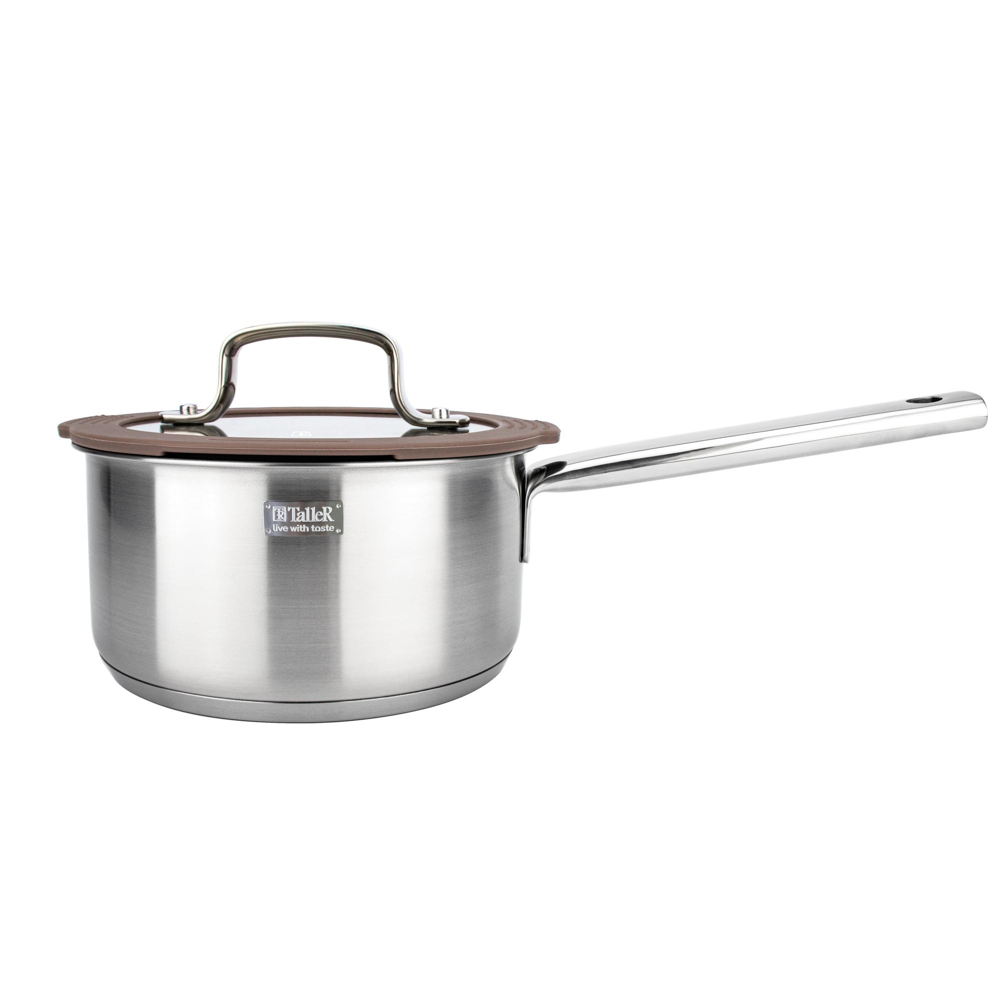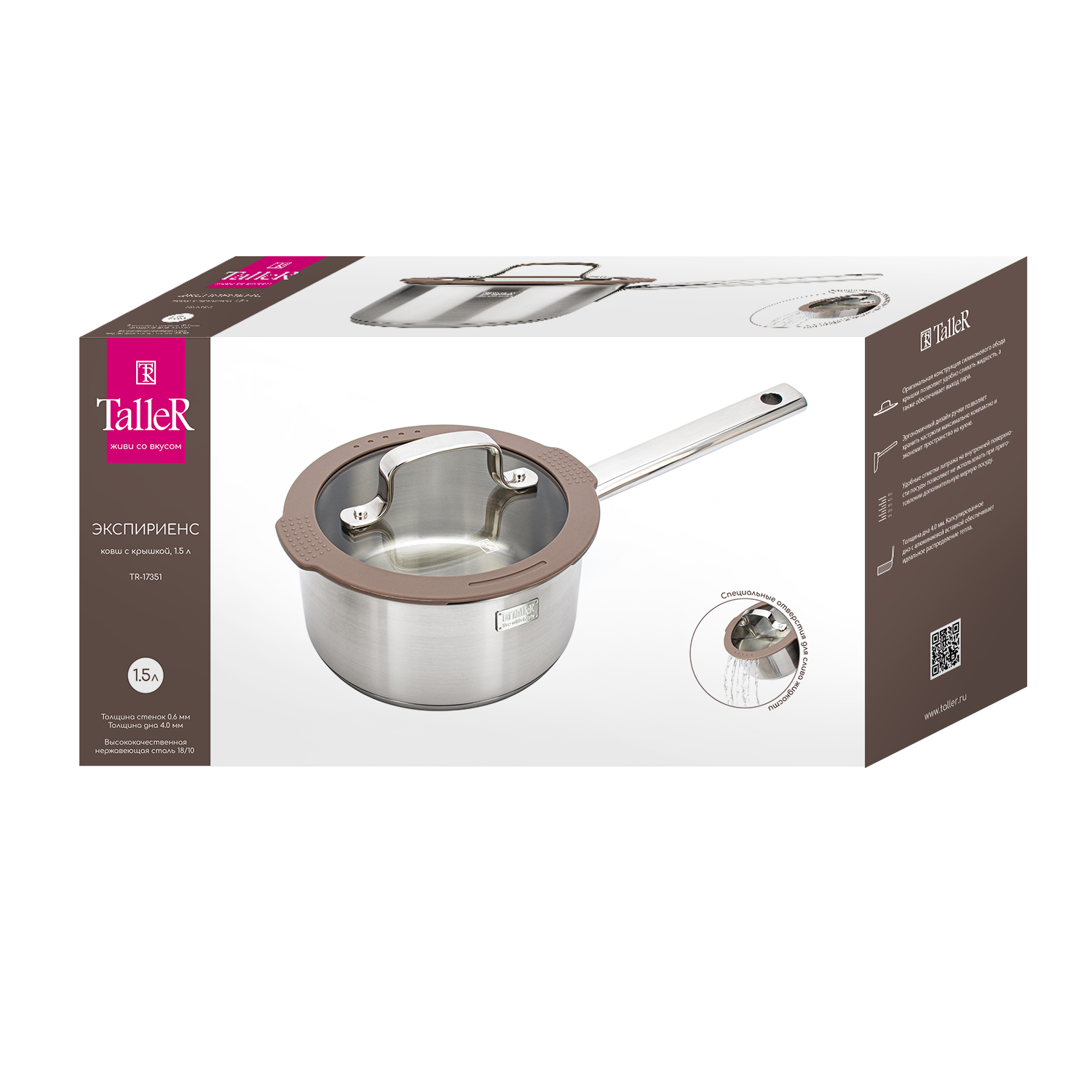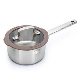Ковш выполнен из нержавеющей стали - 18/10. Комбинированная крышка из закаленного стекла с силиконовым ободом оригинальной конструкции. Удобные отметки литража на внутренней поверхности посуды. Капсулированное дно с алюминиевой вставкой обеспечивает идеальное распределение тепла. Подходит для всех типов плит, включая индукционную. Ковш пригоден для мытья в посудомоечной машине.