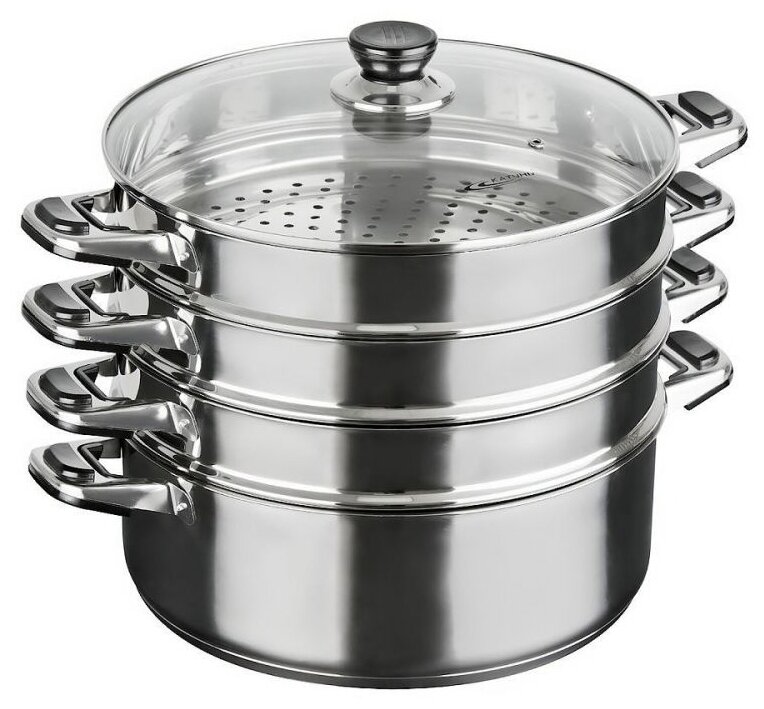 объём кастрюли 7.5 л; в комплекте 3 решетки; глубина одной секции 7 см